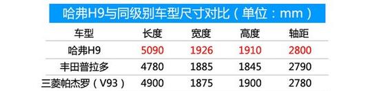 要想明确哈弗H9的车型定位,那么不妨先来看看它的车身参数。哈弗9的长宽高分别为4856/1926/1910mm,轴距为2800mm。这是什么概念呢?就是哈弗H9要比丰田普拉多还大一圈,一起来看——